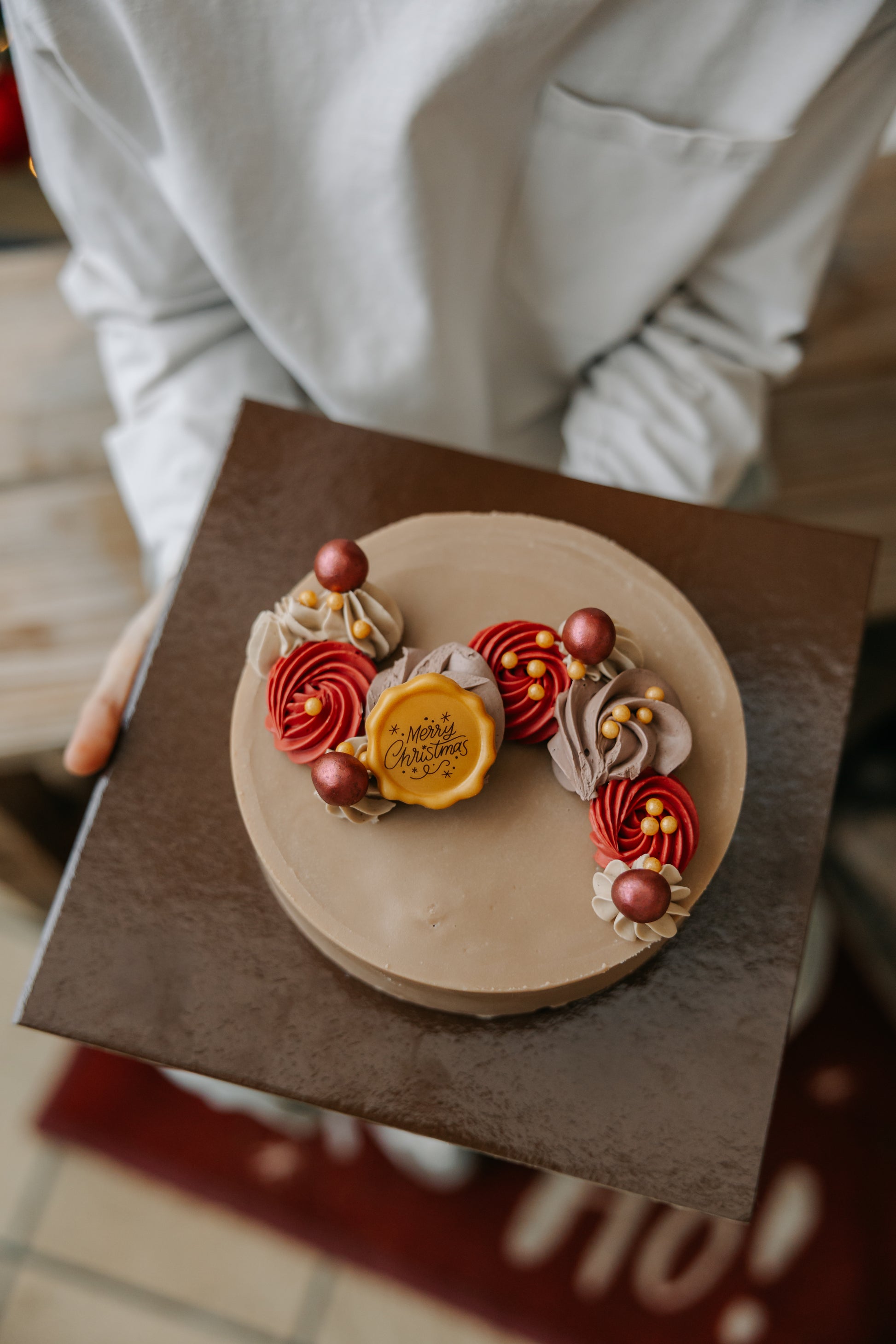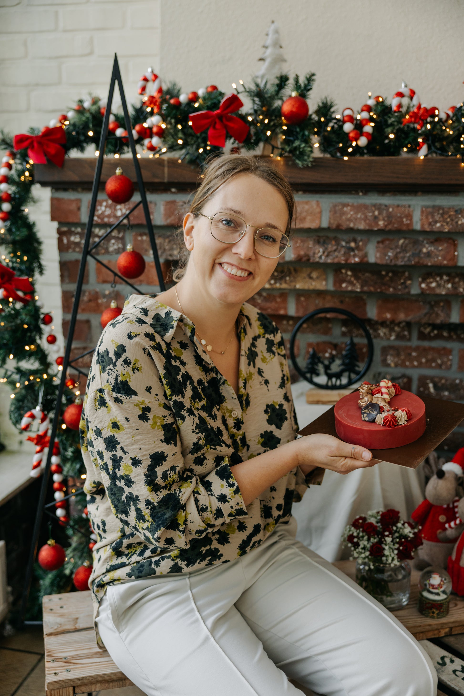 Deze mooie ronde biscuit kan je delen met 6 personen. Vanille biscuit met chocolade ganach.
