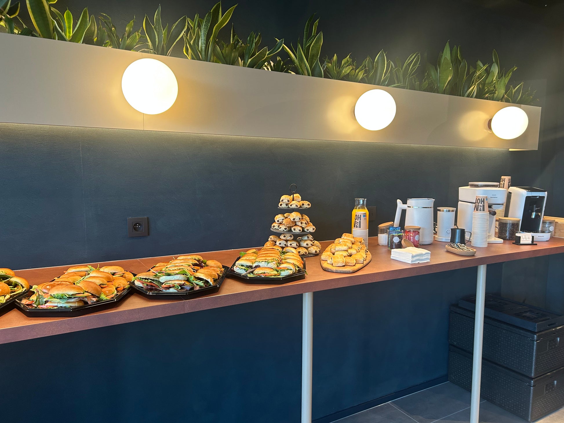 Een royaal ontbijt met een selectie van kleine sandwiches of broodjes, mini koffiekoeken, koffie, thee en vers geperst fruitsap. Alles wordt compleet voorzien: koffiezetapparaat, koffiebonen, deca, waterkoker, thee, melk, suiker, lepeltjes, bekers en servetten. Perfect om samen van te genieten met collega’s voor een vergadering, opleiding of een frisse start van de dag. Een smakelijke en verzorgde manier om iedereen energie te geven en de dag goed te starten.