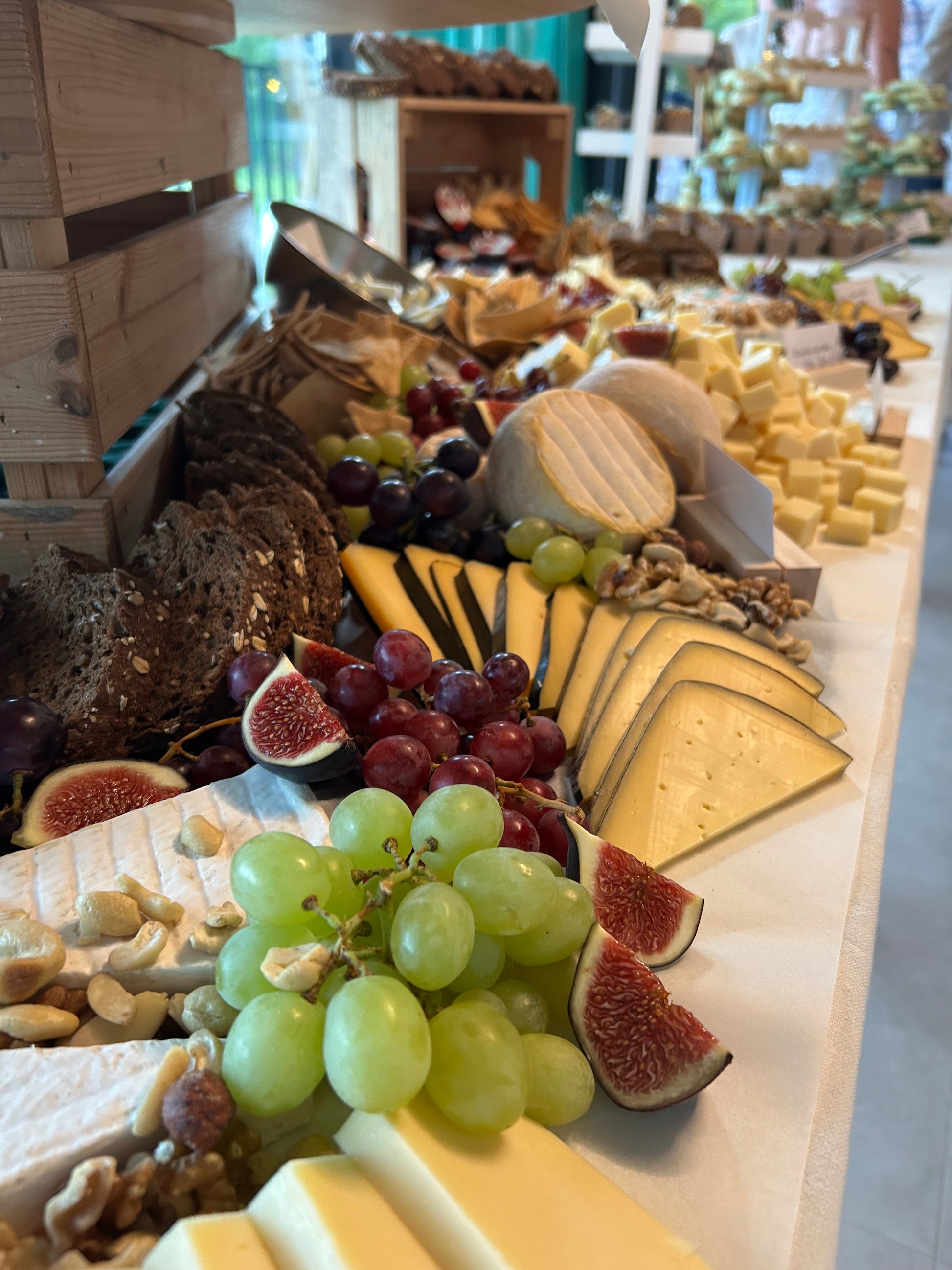 Een samengesteld buffet boordevol lekkers: een selectie van verschillende kazen, notenbrood, vijgenbrood, crackers, rozijnenbrood, gedroogd fruit, noten, verse vijgen, honing, boter en confituur.
