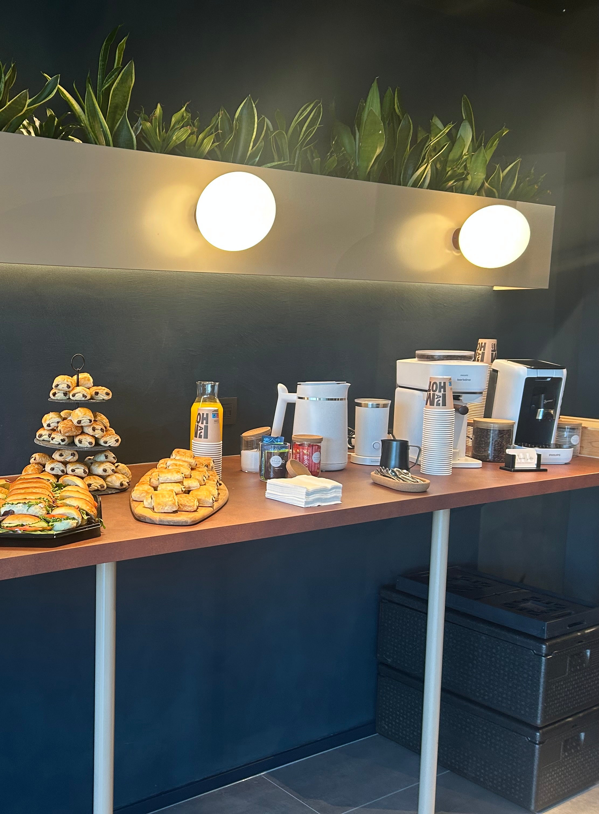 Een heerlijk klein ontbijt met mini koffiekoeken, koffie, thee en vers geperst fruitsap. Alles wordt compleet voorzien: koffiezetapparaat, koffiebonen, deca, waterkoker, thee, melk, suiker, lepeltjes, bekers en servetten. Ideaal om samen van te genieten met collega’s voor een vergadering, opleiding of een frisse start van de dag. Een smakelijke en verzorgde manier om energie te tanken en het team samen te brengen.